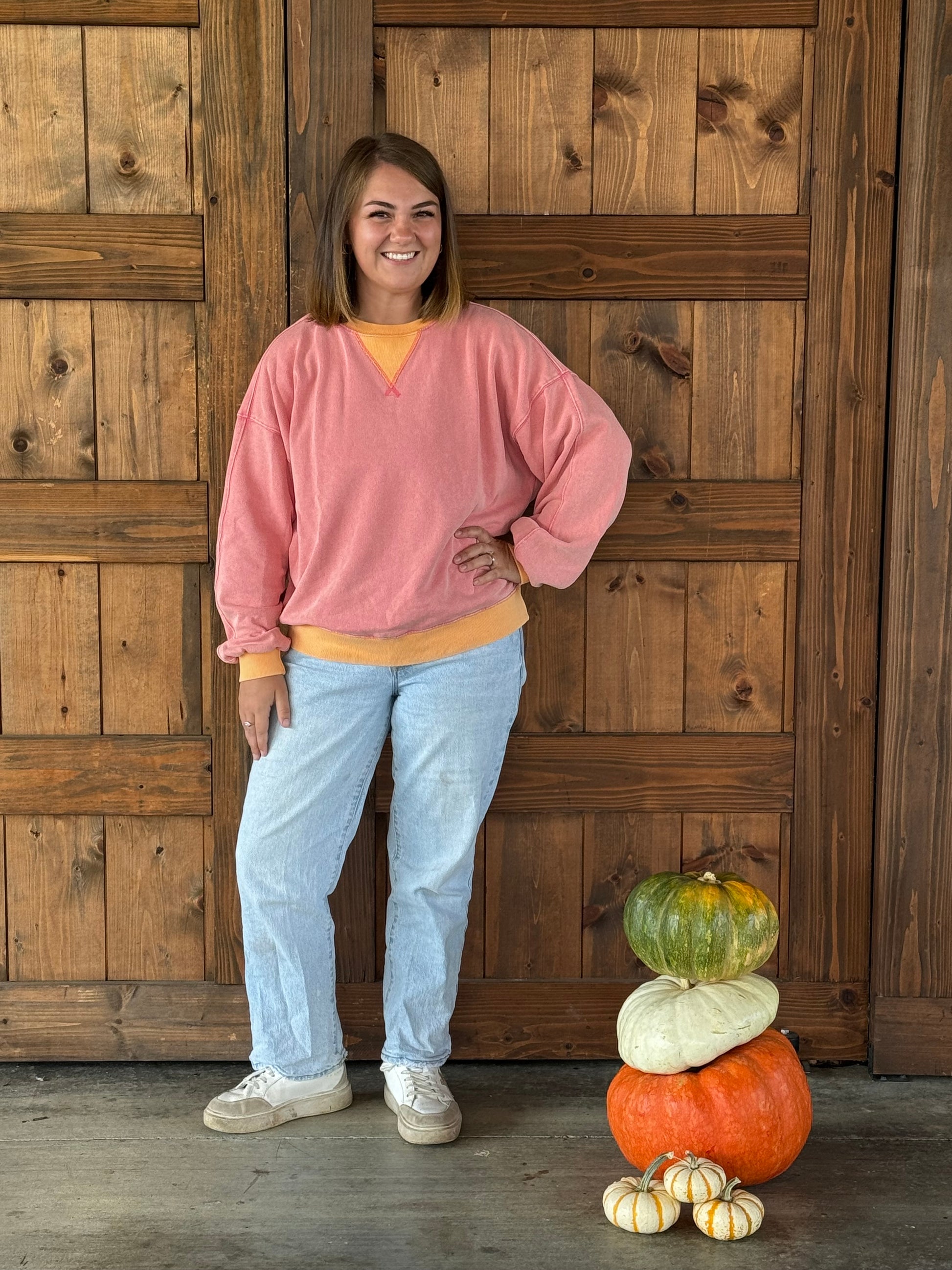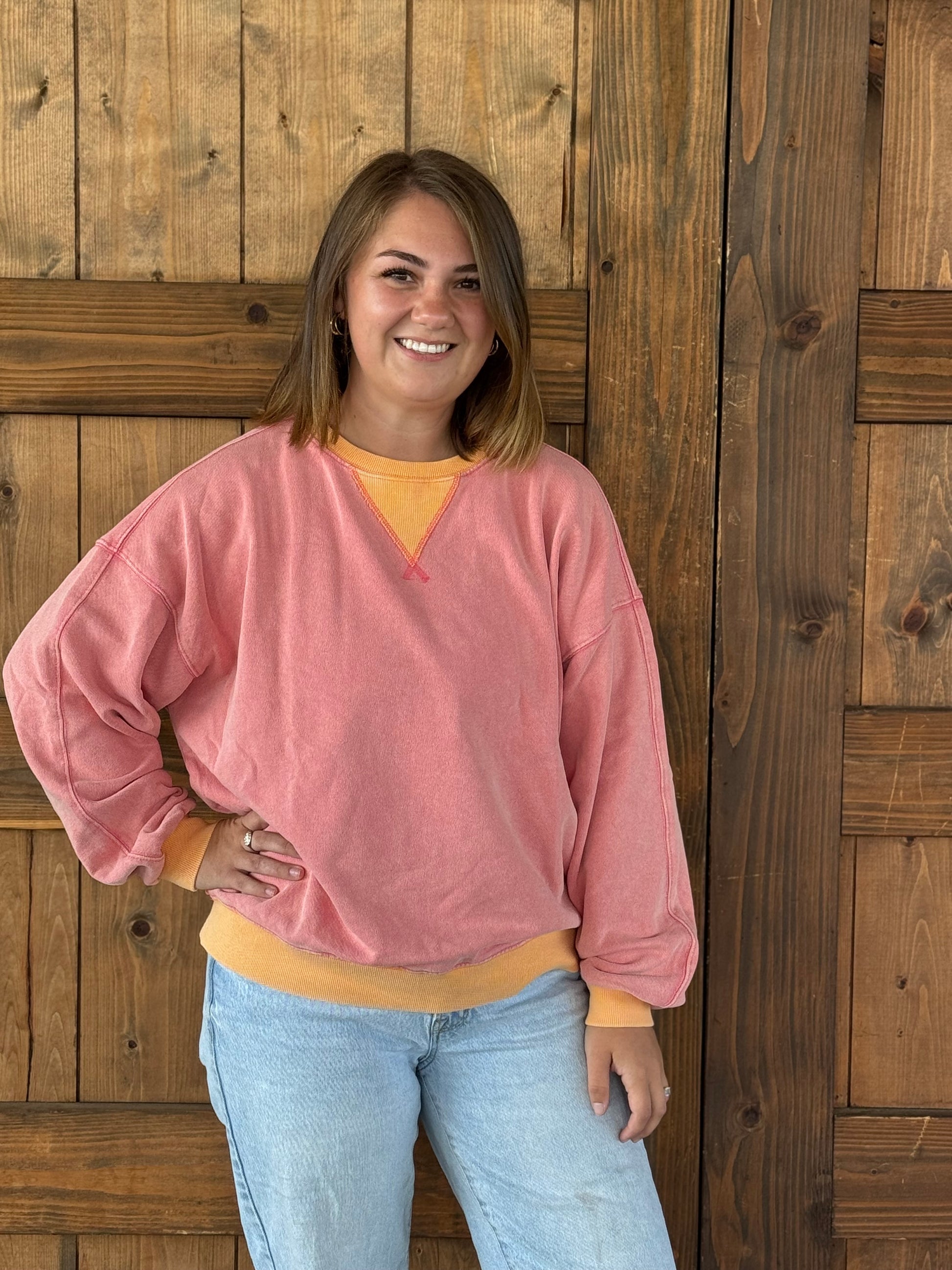 A cozy staple with weekend written all over it. The Saturday Crew brings a soft washed pink tone with orange cuffs for that perfectly undone, “off-duty but pulled together” look. Pairs best with denim, messy buns, and your favorite coffee order.
